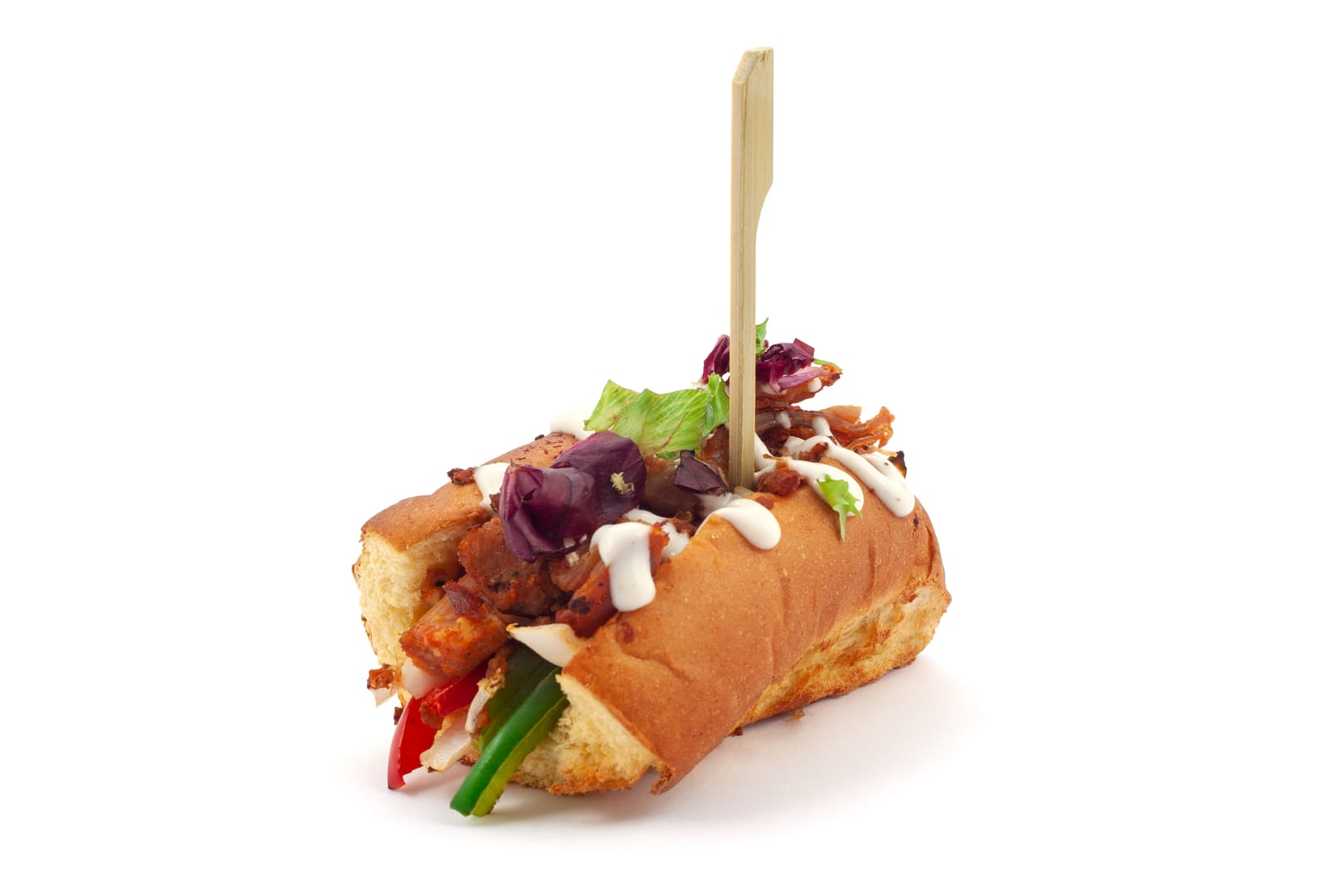 Pa de brioche farcit amb carn de porc guisada al forn amb salsa de iogurt