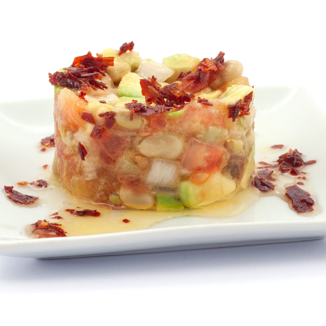 Timbal de tomàquet, ceba, pebrot, porro cruixent i bacallà fumat amb amanit de soja