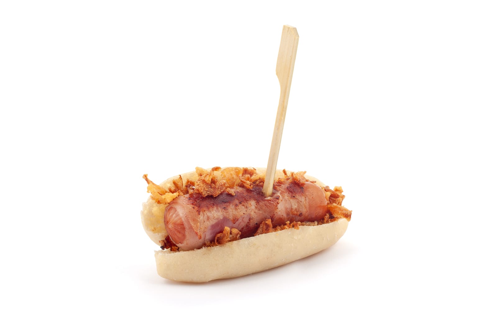 Pa de Viena amb frankfurt, farcit de formatge, envolcallat amb bacon i amb ceba cruixent