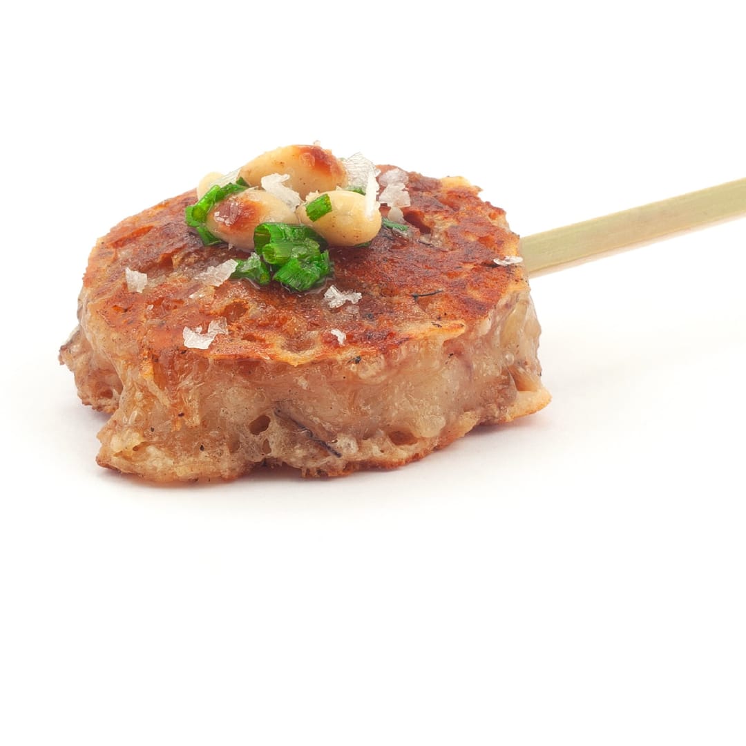 Piruleta cruixent de peus de porc amb ciboulette i pinyons