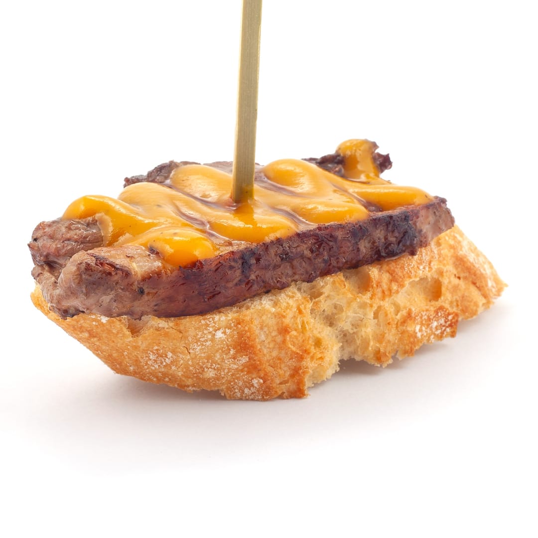 Panet de viena amb hamburguesa de vaca madurada i ceba caramel·litzada
