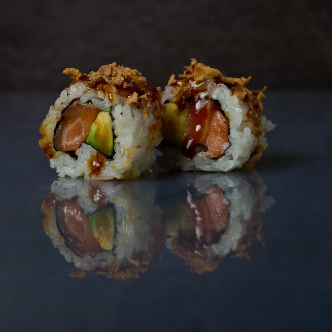 2 nigiri salmó, 2 nigiri salmón flameado, 2 nigiri atún, 4 uramaki california 4 maki de salmón y 4 maki de atún