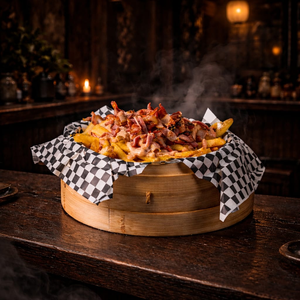 Patatas Dile’s crujientes con salsa golden pink y bacon bits