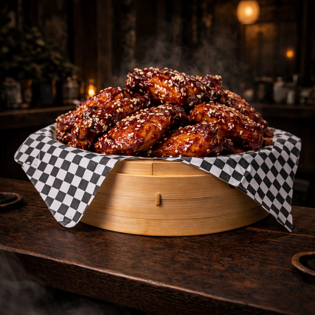 Alitas crujientes con un marinado asiatico 24h esparcido de sesamo tostado y nuestra salsa bbq americana