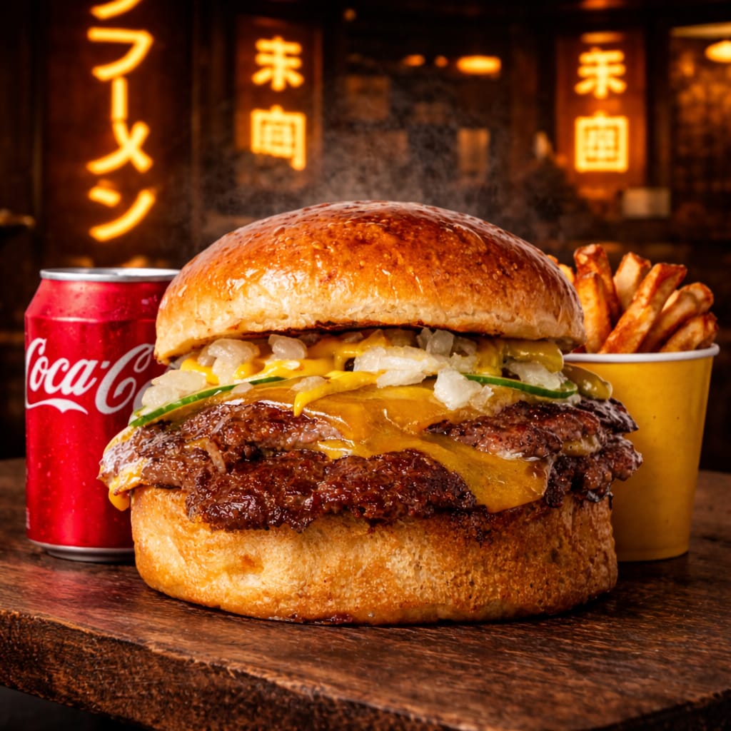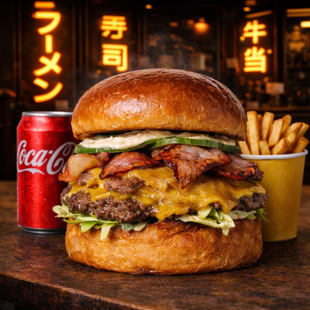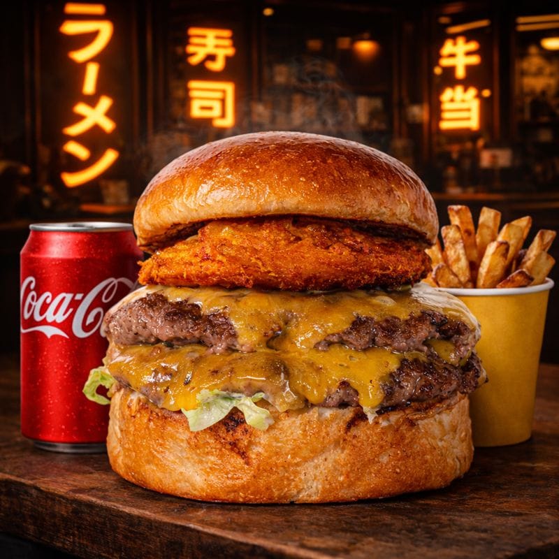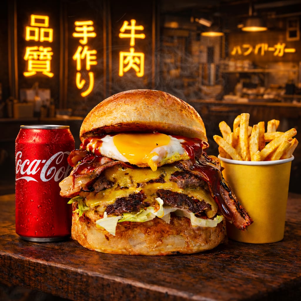 2 Patty de Ternera, Doble Queso cheddar, bacon, salsa bbq, huevo frito, cebolla caramelizada a la plancha, lechuga ice berg, mayo y nuestro pan brioche potato + Patatas Y Bebida