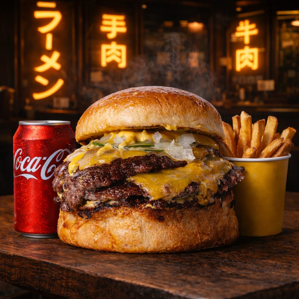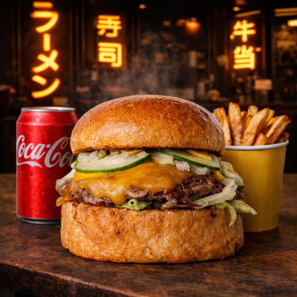 2 Patty de ternera, 2 lonchas de queso cheddar, ketchup, pan brioche potato - Estilo Original: pepinillos gold, mostaza, cebollita en cuadros