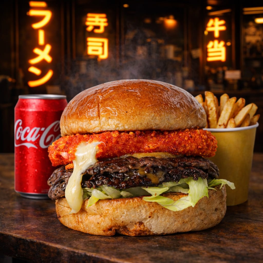 Mozzarella Arrebosada, 2 Patty de Ternera, Doble Cheddar Americano, Lechuga, Ketchup, JalapeñoMayo