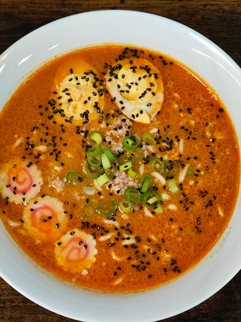 caldo de porc amb carn picada especiada, fideus, naruto, ou marinat i ceba tendre