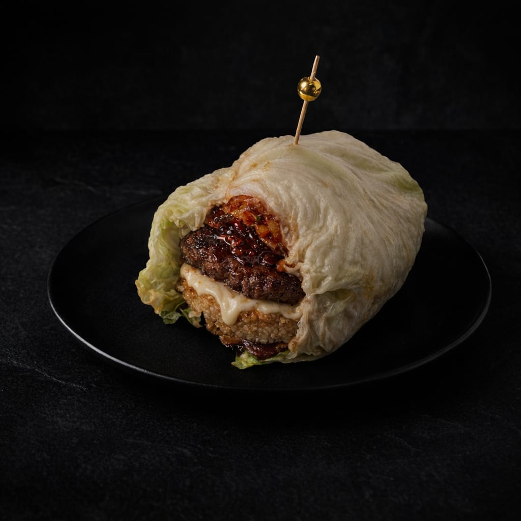 Doble hamburguesa aplastada con "Nurungji" (arroz crujiente con queso y huevo), salsa BBQ coreana, mayonesa de kiwi y kimchi. Todo envuelto en lechuga fresca y crujiente.