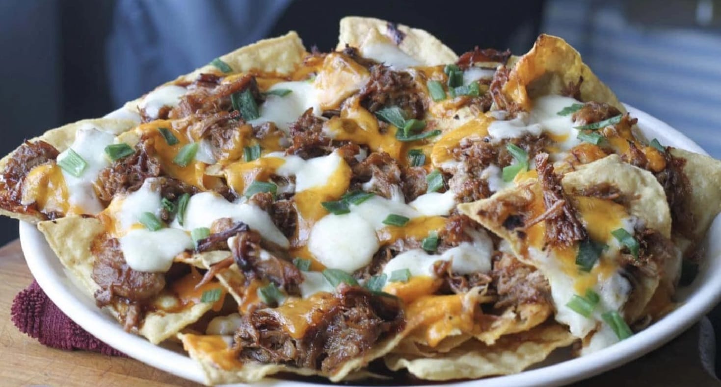 **Por tiempo limitado ** Deliciosos nachos triangulares gratinados con queso, salsa BBQ y una jugosa carne de cerdo deshilachada.