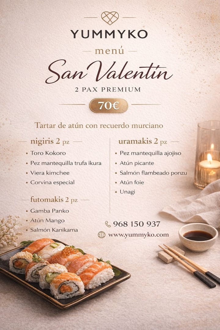 Entrante: Tartar de atún Nigiri 2 pz: Toro Kokoro, Pez Mantequilla Trufa Ikura,Viera Kimchee,Corvina Especial Uramaki 2 pz: Pez mantequilla aojiso, atún picante, salmón flambeado,atún foei,unagi. Futomaki 2 pz: Gamba panko, Atún Mango, Salmón Kanikama