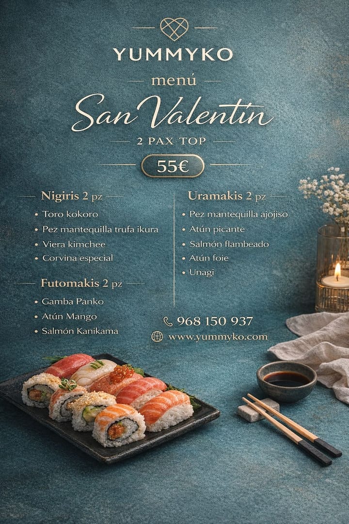 Nigiri 2 pz: Toro Kokoro, Pez Mantequilla Trufa Ikura,Viera Kimchee,Corvina Especial Uramaki 2 pz: Pez mantequilla aojiso, atún picante, salmón flambeado,atún foei,unagi. Futomaki 2 pz: Gamba panko, Atún Mango, Salmón Kanikama