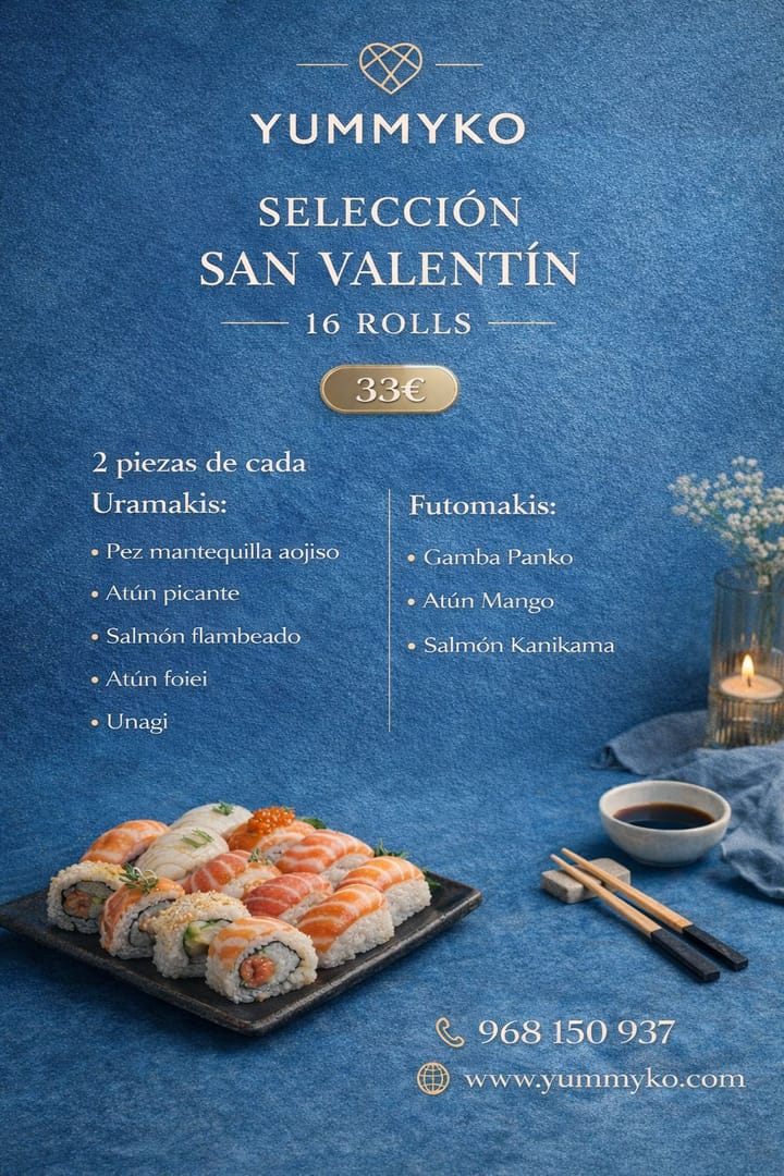 6 nigiri, 12 piezas uramaki, 8 piezas futomaki y 4 piezas hoshomaki